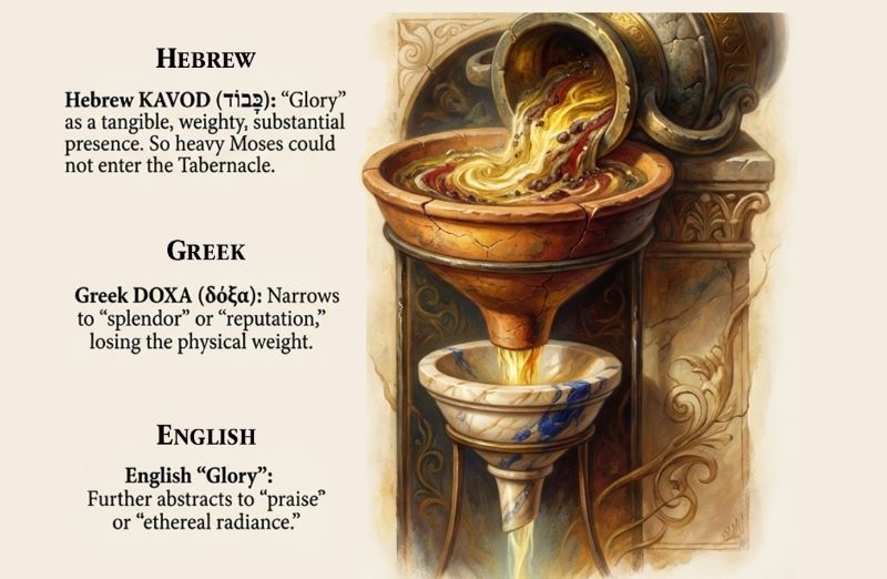 English (“Glory”): Our English word “glory” reinforces this abstract sense. We think of glory as praise, honour, brightness, or ethereal radiance. The Hebrew physical dimension; the idea of a presence so substantial it has weight, is entirely lost. Glory becomes something you give (praise) or see (brightness), not something that weighs on a place.