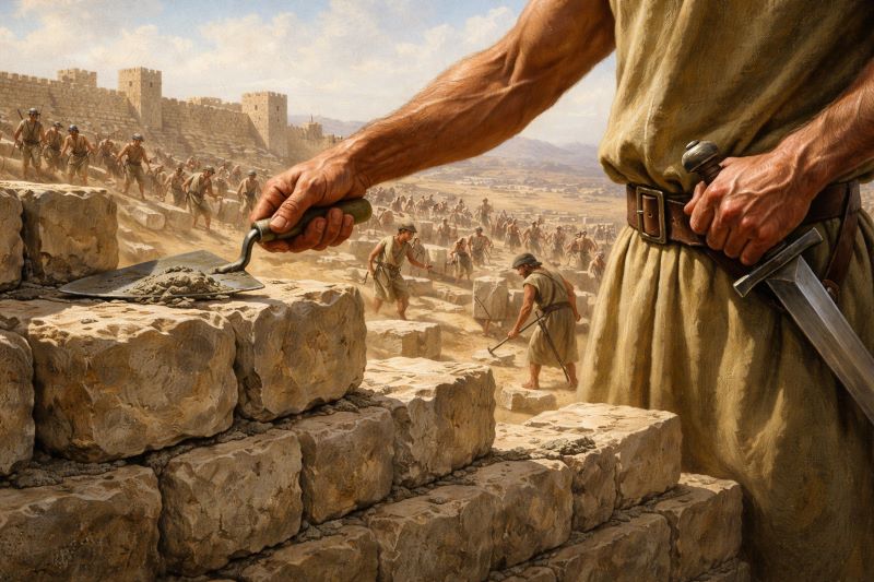Nehemiah’s response is instructive. He doesn’t abandon the work. He doesn’t try to negotiate with the vandals. He doesn’t pretend that the absence of actual fighting means they have peace. Instead, he does both things simultaneously: he builds and he defends.