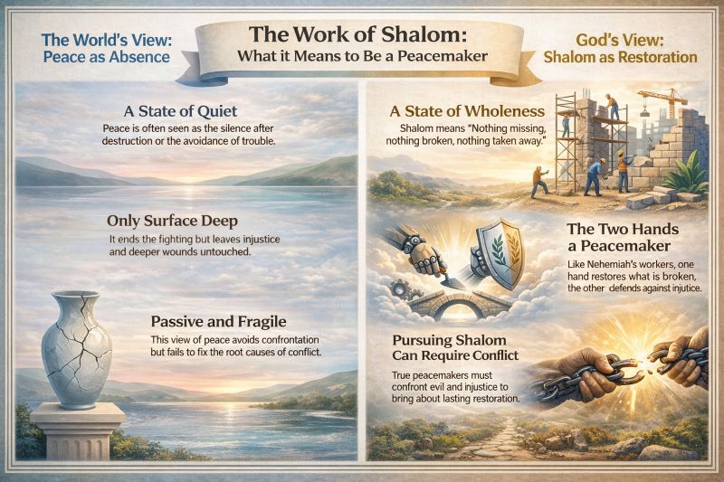 This is the biblical picture of peacemaking. One hand builds. The other holds a sword. Not because Nehemiah is violent or aggressive, but because restoration cannot happen whilst destruction continues. The work of shalom requires both construction and confrontation, both restoration and resistance.