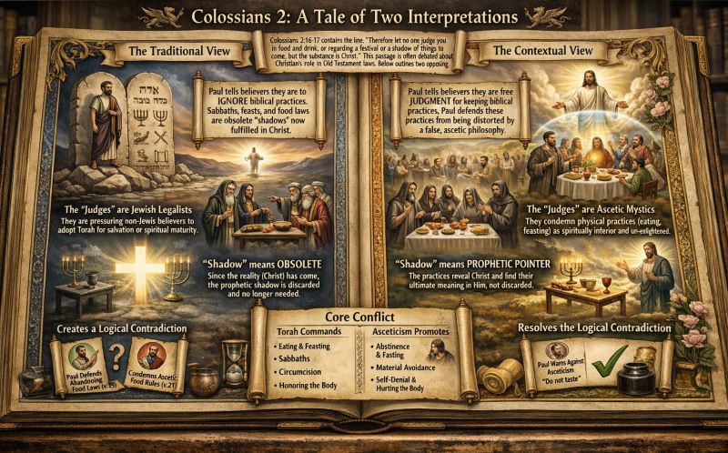 This is not the profile of biblical Judaism. Torah commands eating (feasting), celebrates the material world as God’s good creation, brings people together in community, and sanctifies physical time and space. The Colossian heresy, by contrast, despised physical engagement, promoted mystical visions over embodied obedience, and treated matter as spiritually inferior.