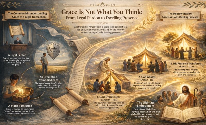 But that’s not the Hebrew understanding of grace at all. The Hebrew words; chen (חֵן) and its related verb chanah (חָנָה), reveal something entirely different. Grace isn’t primarily a legal status. It’s a relational reality. It’s not God declaring you innocent from a distance. It’s God drawing near to dwell with you. And when the Holy One takes up residence in your midst, everything changes—including, especially, what’s expected of you.