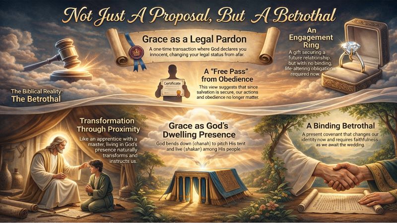 But Hebrew grace is the marriage covenant itself, the binding relationship that creates obligations, identity, and transformation. For Israel at Sinai, this meant completed marriage: “I will take you to be my people, and I will be your God” (Exodus 6:7). God didn’t propose from a distance and wait. He brought them out of Egypt, led them to the mountain, and entered into covenant relationship with them. The dwelling, the presence, the transformation, all of it was a present reality, not a future hope.
